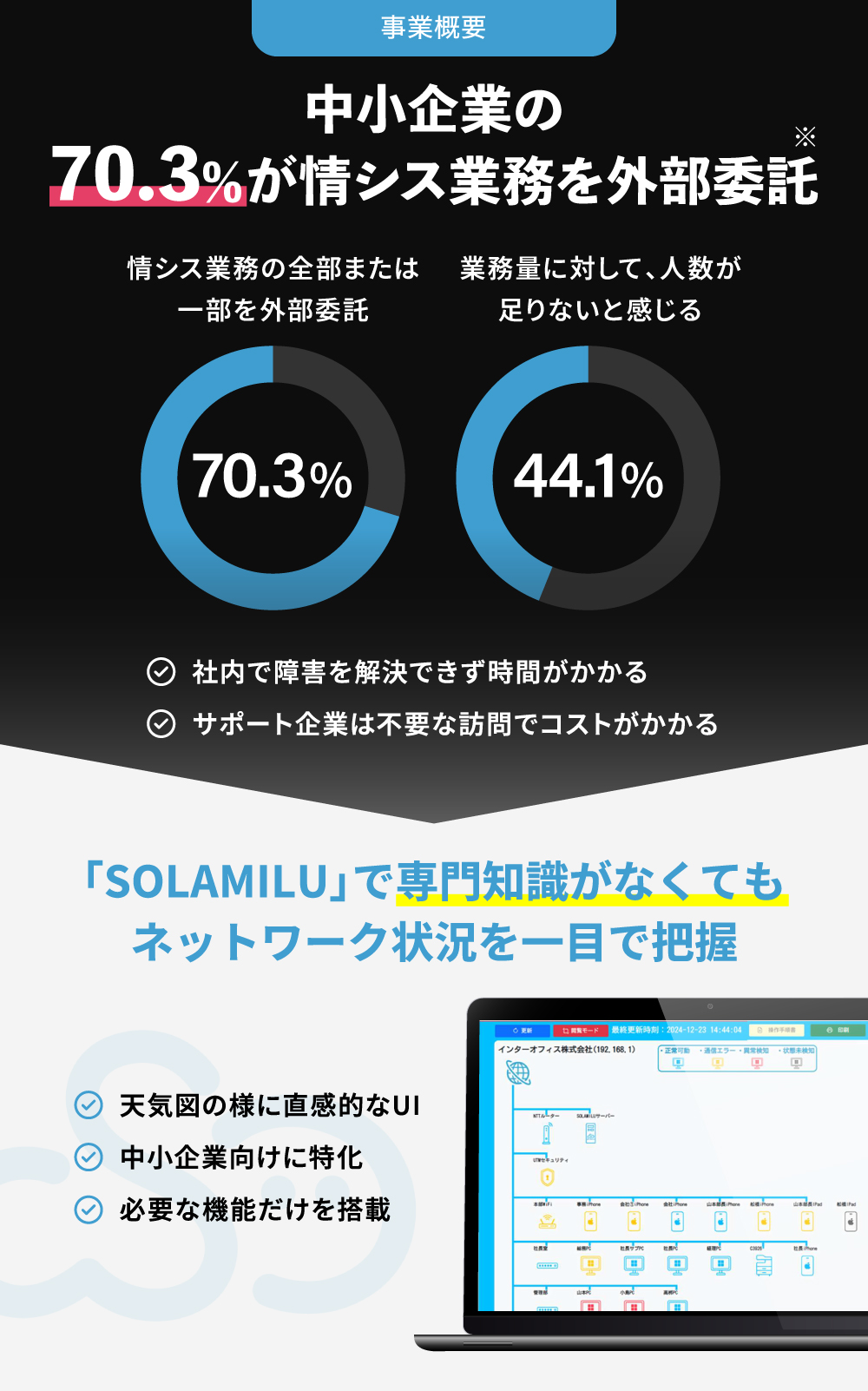 ãŸãããSOLAMILUãã¯ããã²ãšãæ ã·ã¹â»2ãã®ä»ãå°ä»»ã®ãããã¯ãŒã¯æ åœãäžåšã§ãé害察å¿ã販売代çåºã«ä»»ãããããªå šåœã®äžå°äŒæ¥åãã«ç¹åããŠããŸããäžèŠãªæ©èœãæãã誰ã§ãç°¡åã«æäœã§ããã·ã³ãã«ãªèšèšãç¹åŸŽã§ãããšèªè² ããŠããŸãã