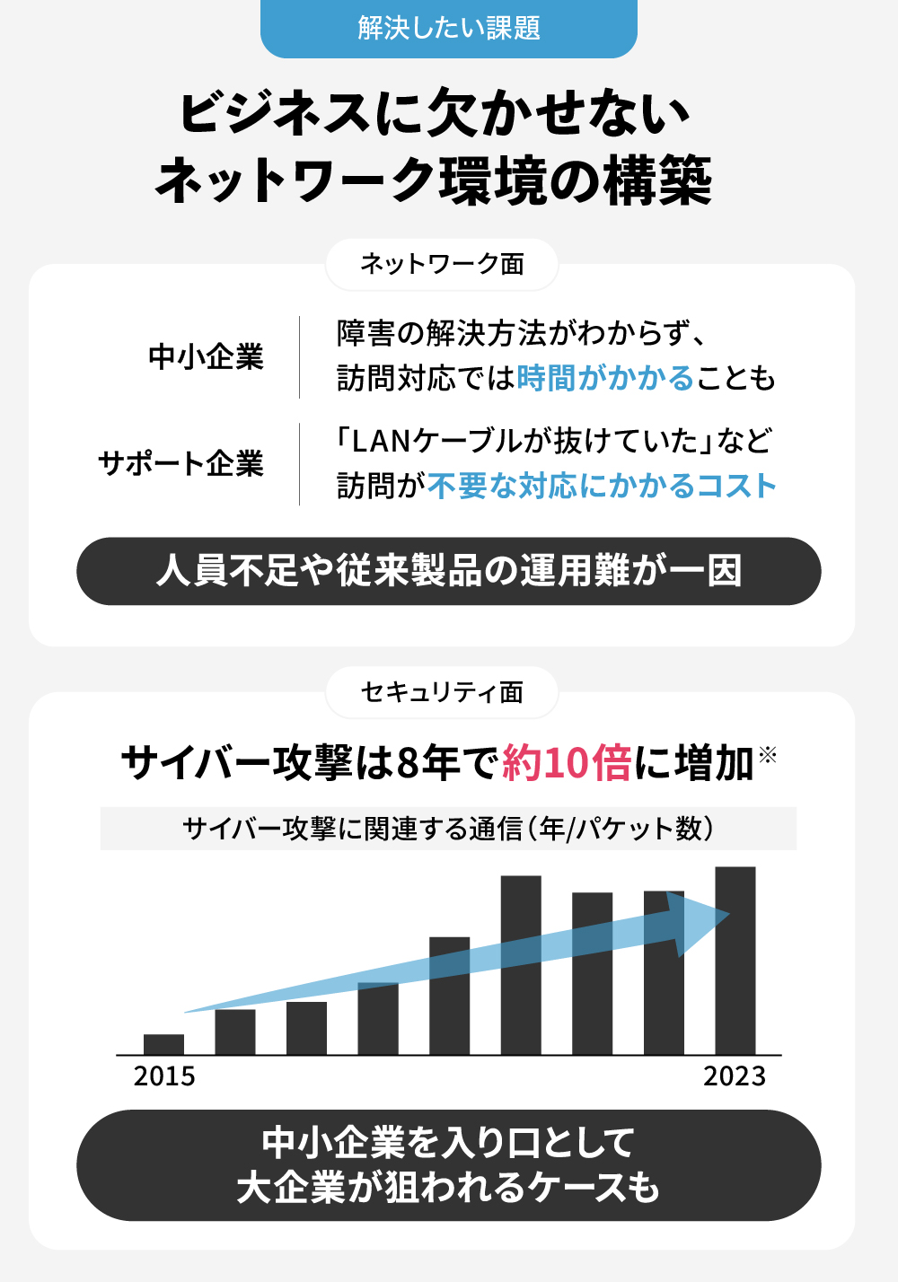 こうした課題を解決し、中小企業のネットワーク環境を「可視化・効率化・セキュリティ監視」することが、弊社の使命だと考えています。