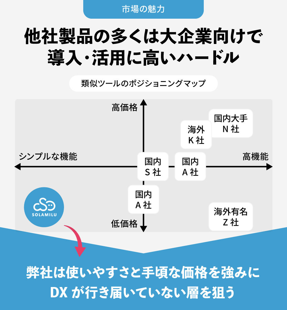 「SOLAMILU」は、この大多数を占める中小企業をターゲットとし、導入の容易さと手頃な価格を強みに市場開拓を図ります。また、近年注目を集める経営DXの流れを汲み、クラウド会計サービスのような使いやすいSaaSツールとして提供します。