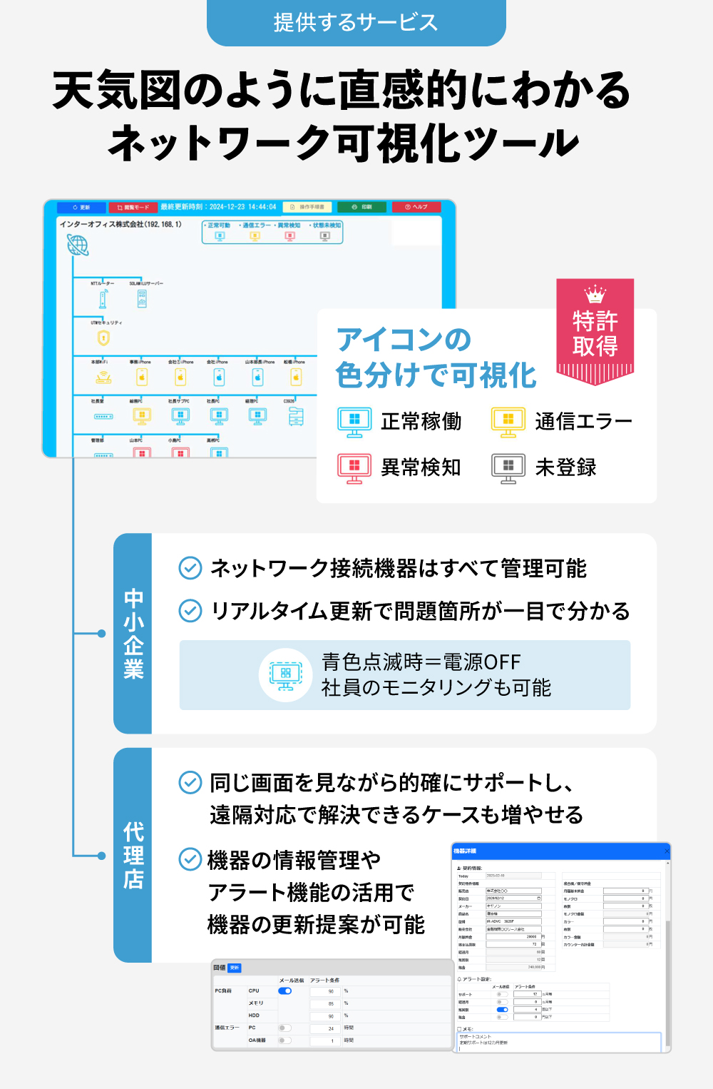 「SOLAMILU」をPCにインストールすると、ネットワークに接続されたあらゆる機器を自動で識別し、構成図として表示します。パソコンやスマホ、複合機はもちろん、ロボット掃除機やエアコンなど、ネットワークに接続された機器であればすべて管理が可能です。さらに、監視対象に設定した機器に異常が発生すると、アイコンの色が変わる仕組みを採用。この色分けによる可視化技術は、特許(第7572023号)を取得しています。