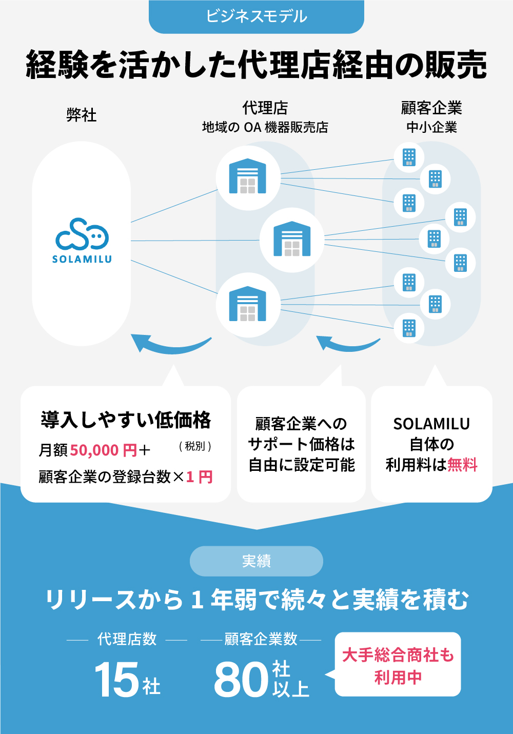 現在「SOLAMILU」の代理店は15社、大手情報通信系総合商社を含む80社以上に導入いただいています※。