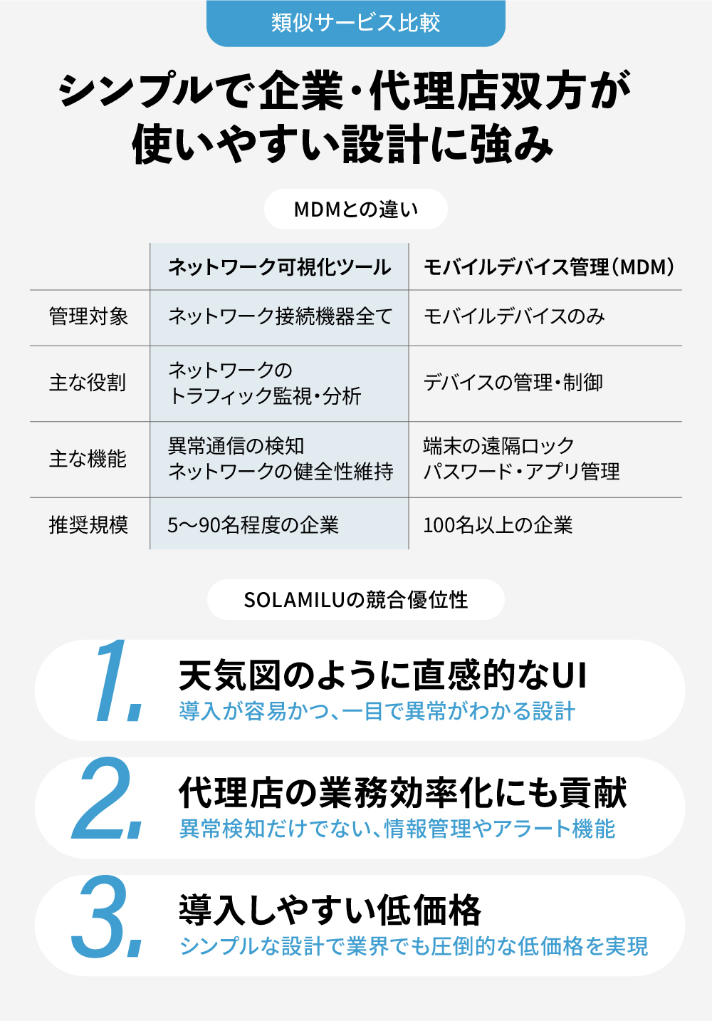 また、「SOLAMILU」は、「ひとり情シス※2」の他、専任のネットワーク担当が不在で、障害対応を販売代理店に任せるような全国の中小企業向けに特化しています。不要な機能を排し、誰でも簡単に操作できるシンプルな設計が特徴であると自負しています。