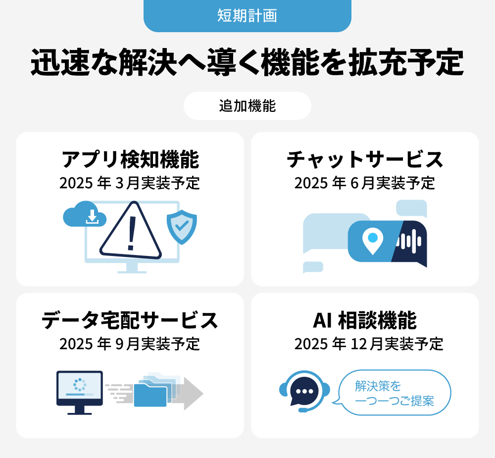 「SOLAMILU」には順次、機能追加も予定しています。現在予定しているのは、「アプリ検知機能」「チャットサービス」「データ宅配サービス」「AI相談機能」の4つです。
