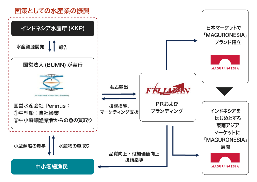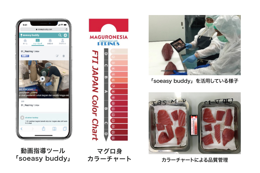 政府の協力を仰ぎ国営の水産企業と協業し、インドネシアの漁業従事者にマグロの漁獲方法をはじめ、加工指導、HACCP(食品を製造する際に安全を確保するための、国際規格の管理手法)に沿った衛生管理指導、物流などを一貫して技術指導しています。
