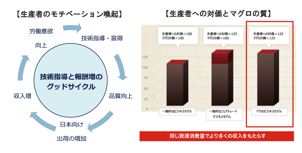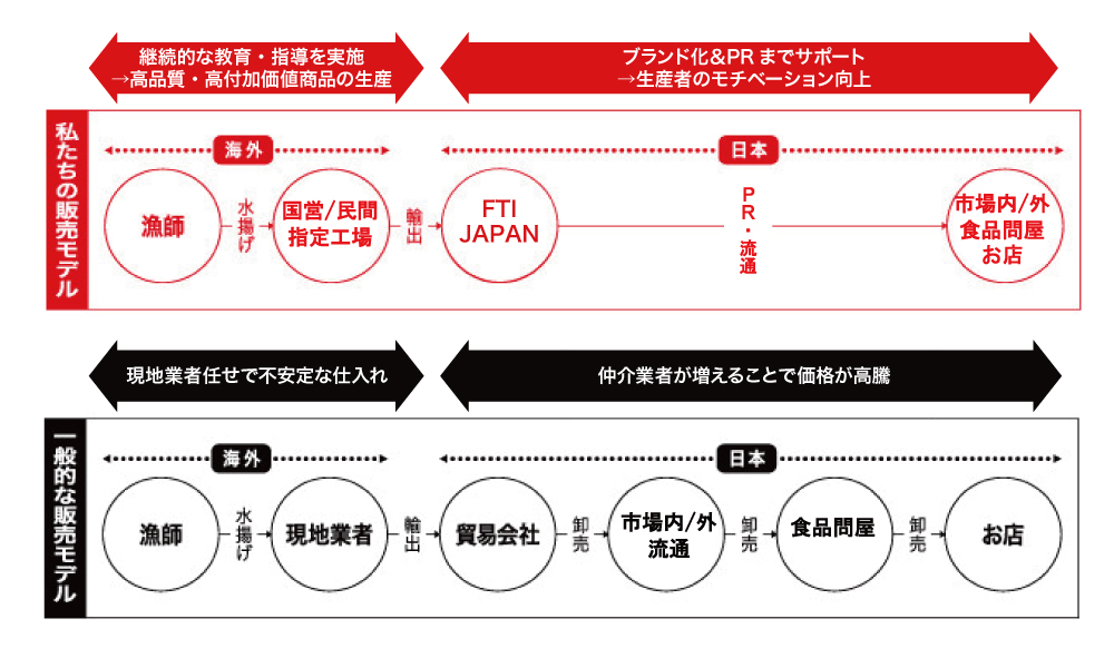 また、当ビジネスを中間の流通業者を極力少なくし、自社で一気通貫で行うことにより、現地の漁業技術力の向上と、対価に見合った報酬を付与することができます。