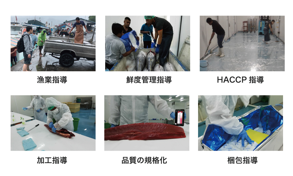 政府の協力を仰ぎ国営の水産企業と協業し、インドネシアの漁業従事者にマグロの漁獲方法をはじめ、加工指導、HACCP(食品を製造する際に安全を確保するための、国際規格の管理手法)に沿った衛生管理指導、物流などを一貫して技術指導しています。