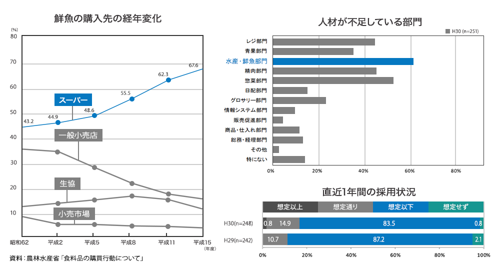 さらに、消費者の鮮魚の購入先の変化として、近年ではスーパーマーケットがトップになっていますが、そのスーパーマーケット内の人材も不足しています。人材不足からインストア加工に人員がさけず、また、求人も順調に進まないことから、スーパーマーケット内の人材が不足している部門は「水産・鮮魚部門」がトップになっています。
