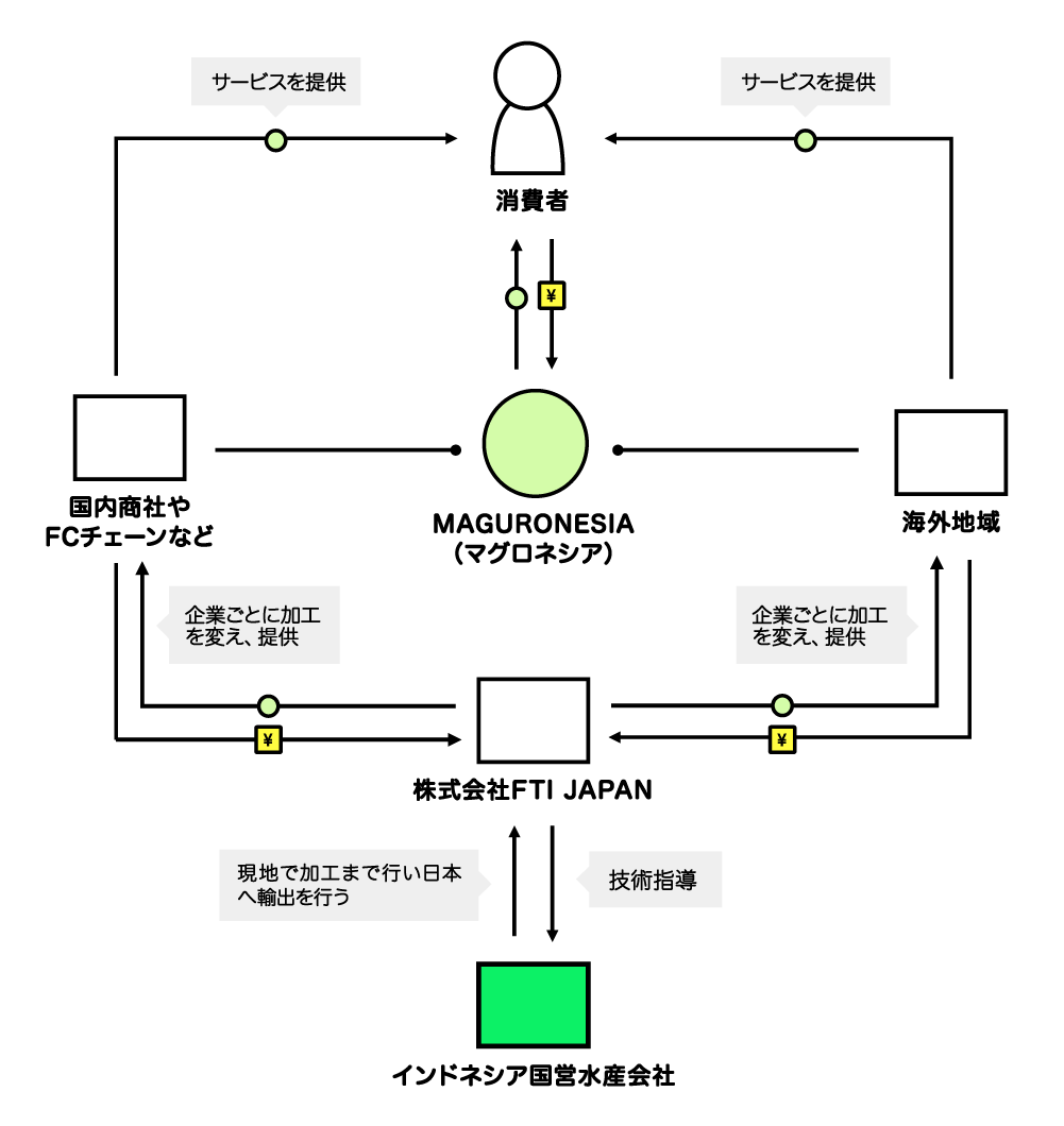 弊社は「マグロ輸入ベンチャー」として、インドネシア産マグロの「現地加工指導」「出荷」「輸入」を行い、国境を越えたサプライチェーンを構築し、国内で「MAGURONESIA(マグロネシア)」というブランド名で展開しています。