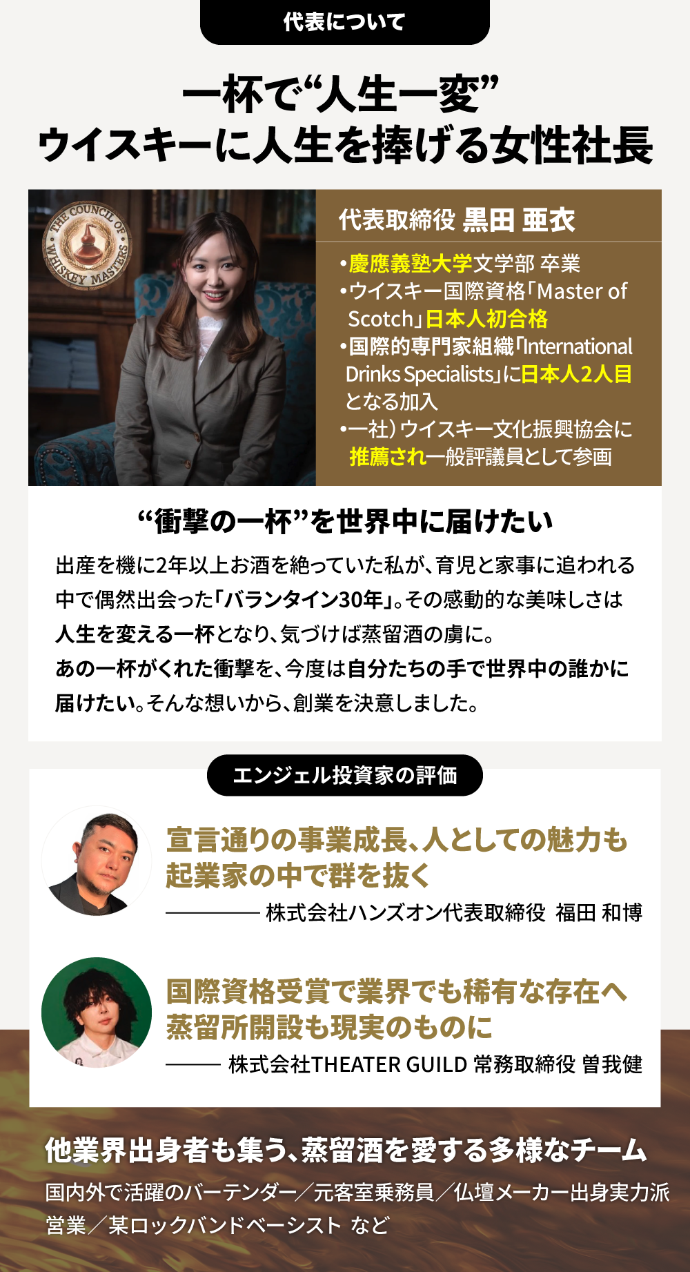 さらに黒田さんは、日本人で初めてウイスキーの国際資格「MASTER OF SCOTCH」を取得した本格派。その専門性を背景に、国内蒸留所の開設計画も着実に前進しており、つくり手として世界市場に挑む近未来が今から楽しみです! 世界の蒸留酒と日本のクラフトマンシップをつなぎ、新しい「飲む文化」を切り拓くアンドスピリッツ。その飛躍を後押しするのは、今このページをご覧の皆さまのご支援です。ともに、日本発のグローバルブランドを育てていきましょう!!