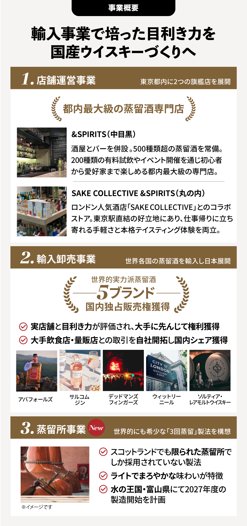 アンドスピリッツ株式会社は、蒸留酒専門店「&SPIRITS」の運営にとどまらず、英国の Saltire Rare Malt Whisky や Whitley Neill Gin をはじめとする世界のスピリッツを日本市場に紹介するディストリビューター事業を立ち上げ、わずか数年で取り扱いブランド数を次々と拡大してきました。