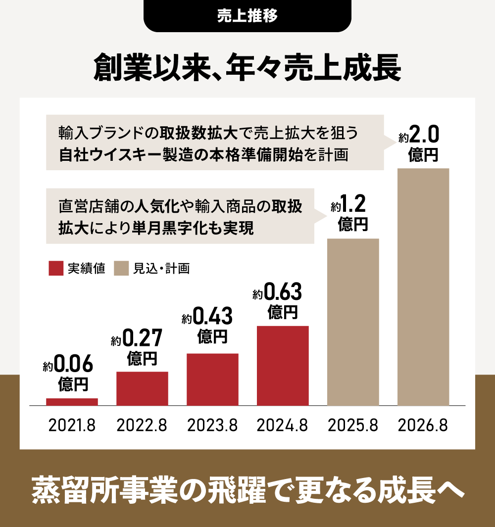 蒸留所での生産体制を安定させつつ、カスクオーナーの募集などを通じたキャッシュインの仕組みも積極的に模索していきたいと考えています。また、都内の自社店舗ではニューメイクを先行体験できる場を設けるほか、ニューメイクカクテルといった熟成前ならではの限定メニューを開発し、熟成期間そのものを楽しんでいただける体験価値を創出していきたいと考えています。自社店舗を持つ強みを最大限に活かし、ブランドへの期待感を高めます。輸入卸売部門では、既存ブランドの全国的な地位が確立するので、今後は新たなブランドの導入を視野に入れます。