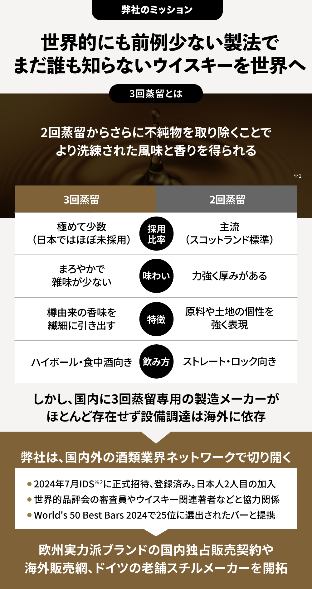 私たちは、世界的に希少な「3回蒸留」のウイスキー製造を通じて、蒸留酒文化に新たな潮流を生み出そうとしています。