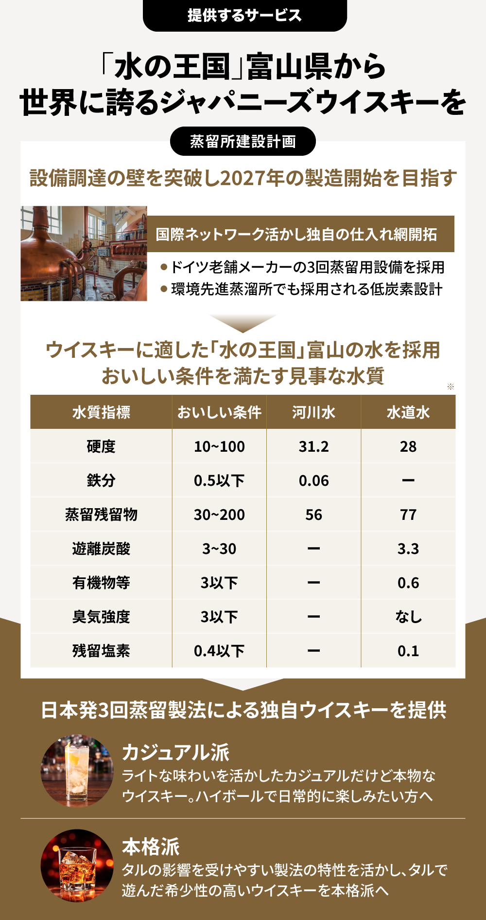 新蒸留所は2027年ごろ、富山県に建設完了予定。日本屈指の水を活用し、スコッチ文化と日本の自然資源を融合させたブランドづくりを進めます。
