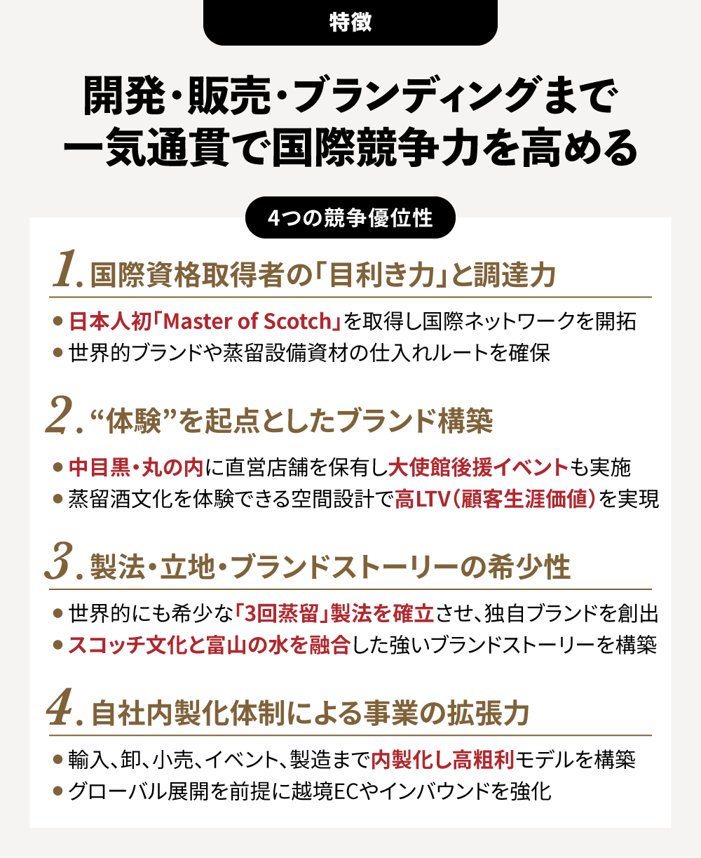 新規事業として、世界的にも希少な「3回蒸留」によるジャパニーズ・ウイスキー製造に挑戦。スコッチの伝統と富山・立山の自然を掛け合わせ、製法の希少性・産地の説得力・世界で通用するストーリーテリングを統合。競合が容易に再現できない“勝ち筋”を描く。