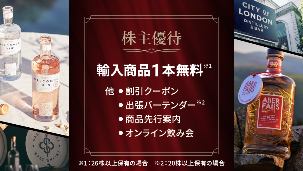 弊社では、株主の皆様のご支援に感謝するとともに、弊社サービスへの理解を深めていただき、より多くの方に弊社のウイスキーをお楽しみいただくための優待サービスを提供しております。詳しくはこちらからご確認ください。