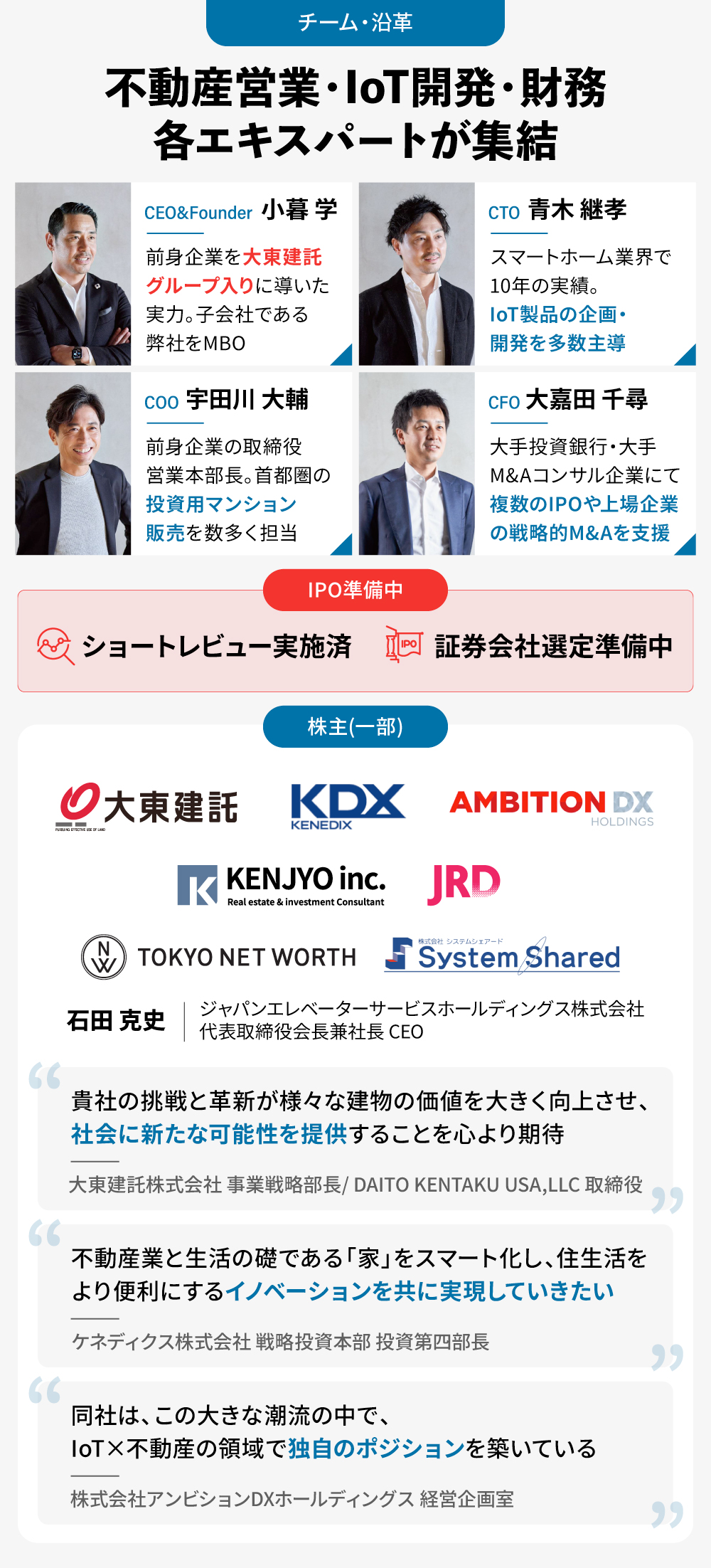 チームには、大手投資銀行や大手M&Aコンサルタント企業にて、複数のIPOや上場企業の戦略的M&Aの支援を行ってきた大嘉田をはじめ、不動産業界に精通した営業メンバー、IoTのソフトウェア開発やIoTデバイスの導入工事を行うメンバーなど、各分野のエキスパートが揃っています。