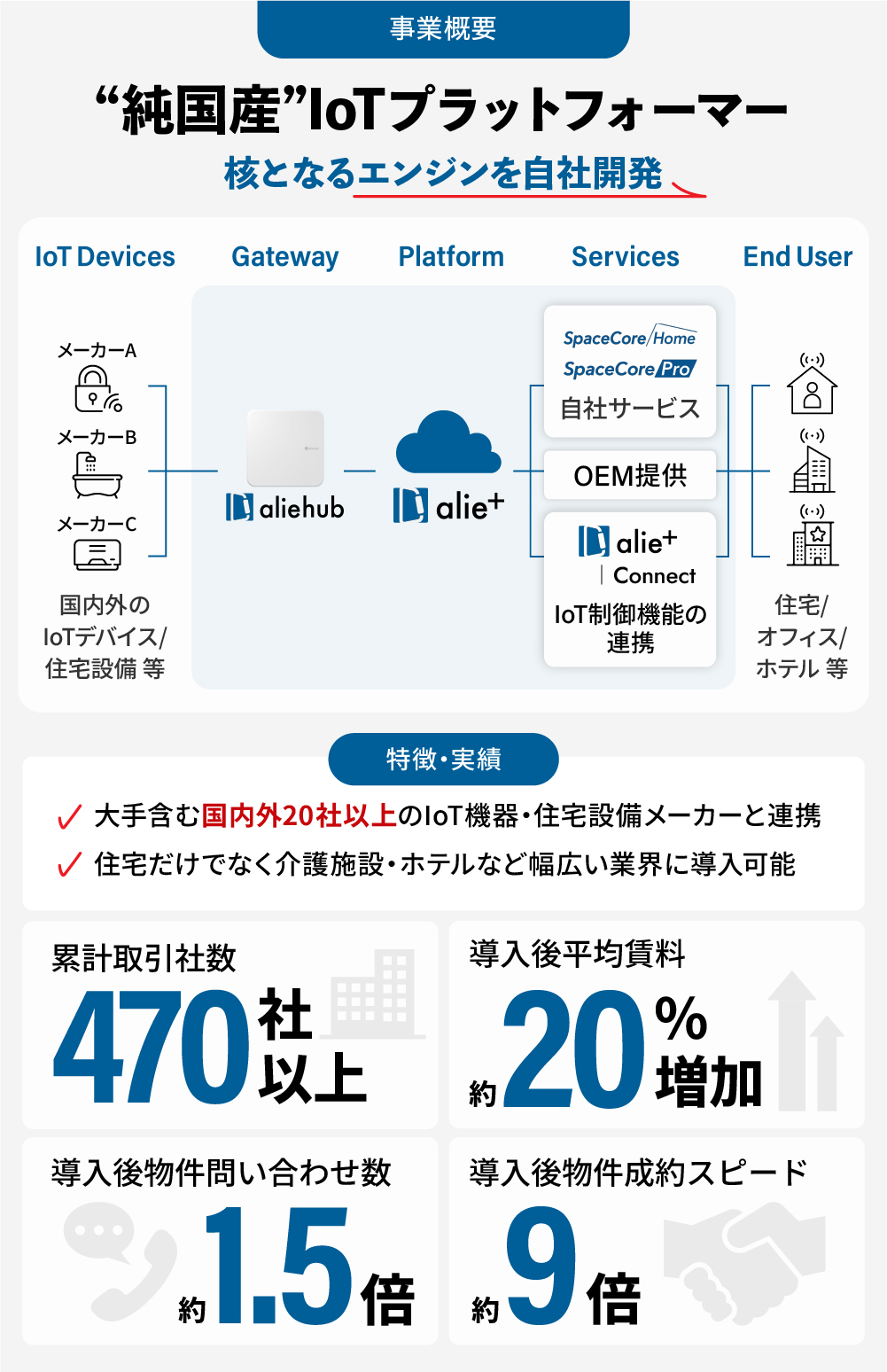 弊社は、「IoTを、日本社会の”あたりまえ”に」をビジョンに掲げ、自社開発IoTエンジン「alie+(アリープラス)」を中核とするIoTプラットフォーマーです。住宅メーカーや不動産事業者向けに提供する「SpaceCore」を中心に、現在では470社以上の企業との取引を行っています。また、弊社はシステム提供にとどまらず、IoTの導入にかかる電気工事・設置、導入後のテクニカルサポートまでワンストップで提供しています。