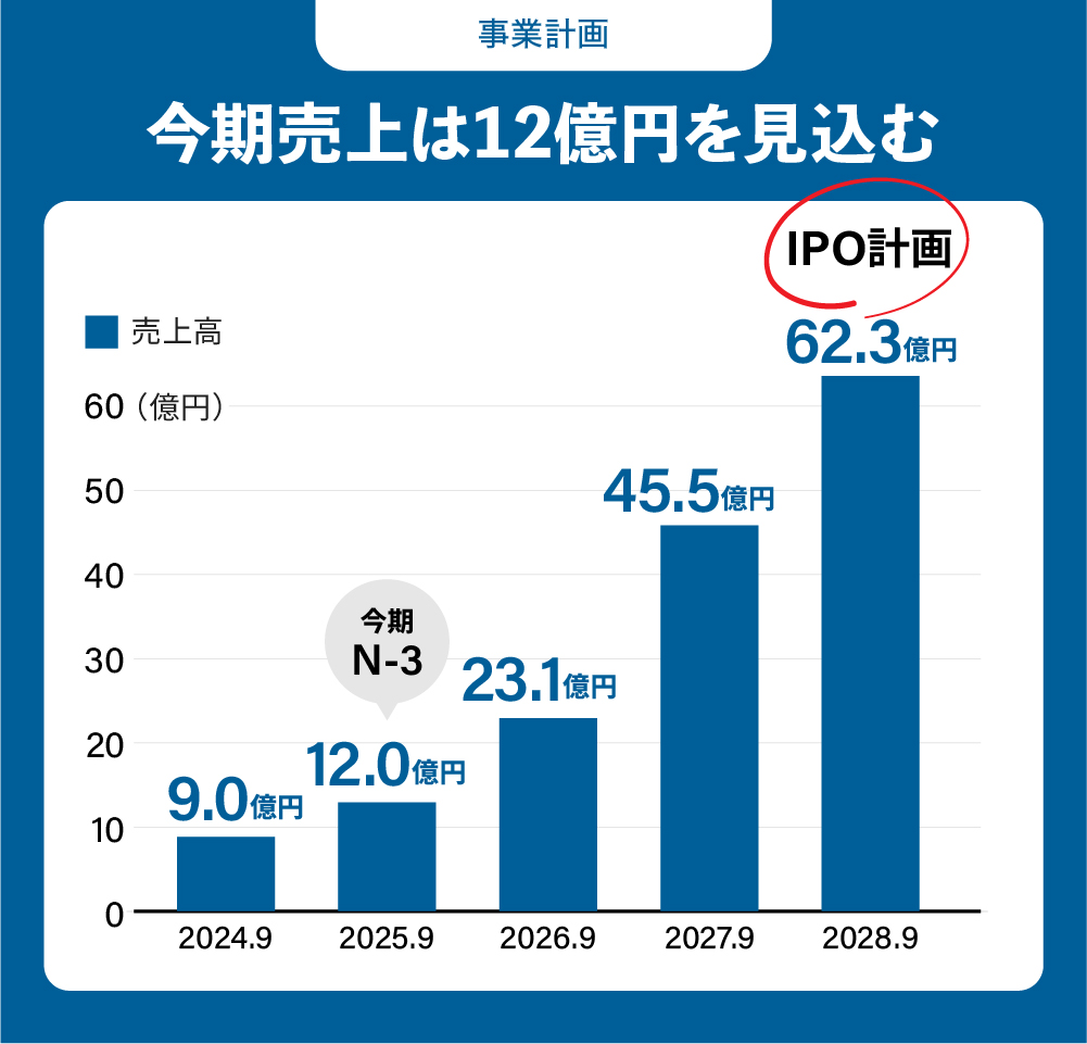 下の表は現時点において今後の経営が事業計画通りに進展した場合のスケジュールです。そのため、今回の資金調達の成否、調達金額によって、スケジュールは変更となる場合がございますので、予めご了承ください。また、売上高は事業計画を前提としており、発行者の予想であるため、将来の株価及びIPO等を保証するものではありません。