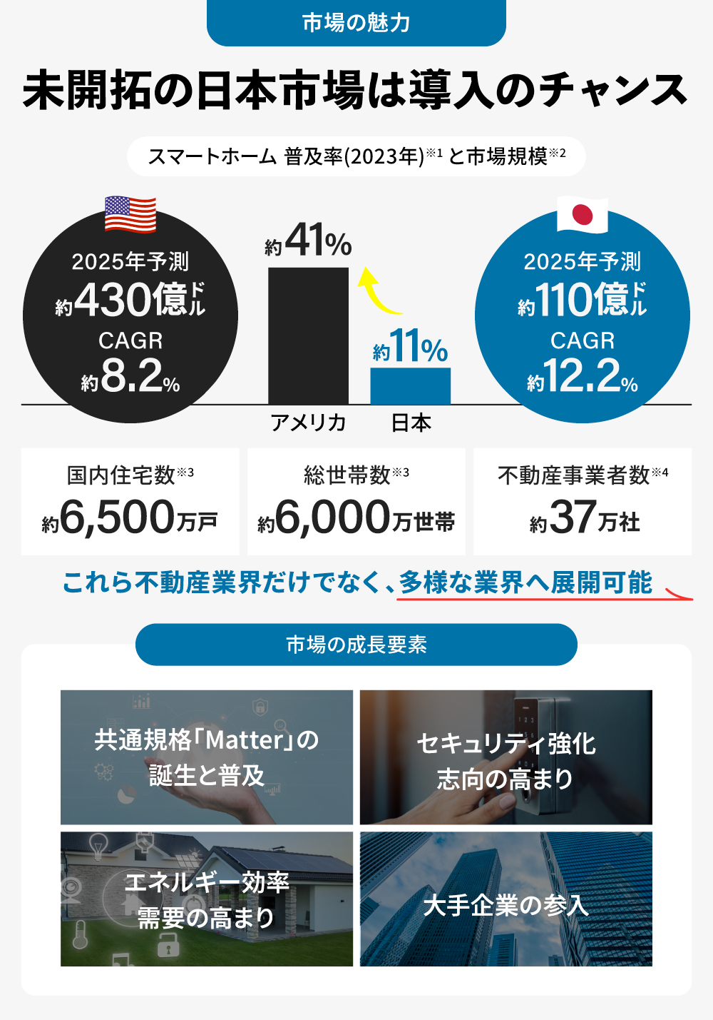 スマートホーム先進国のアメリカでは普及率は約41%と高く、世界的にもスマートホームの標準化が加速しています。一方で、日本の導入率は約11.0%と低い水準にとどまっており、今後の成長余地は極めて大きいといえます※1。