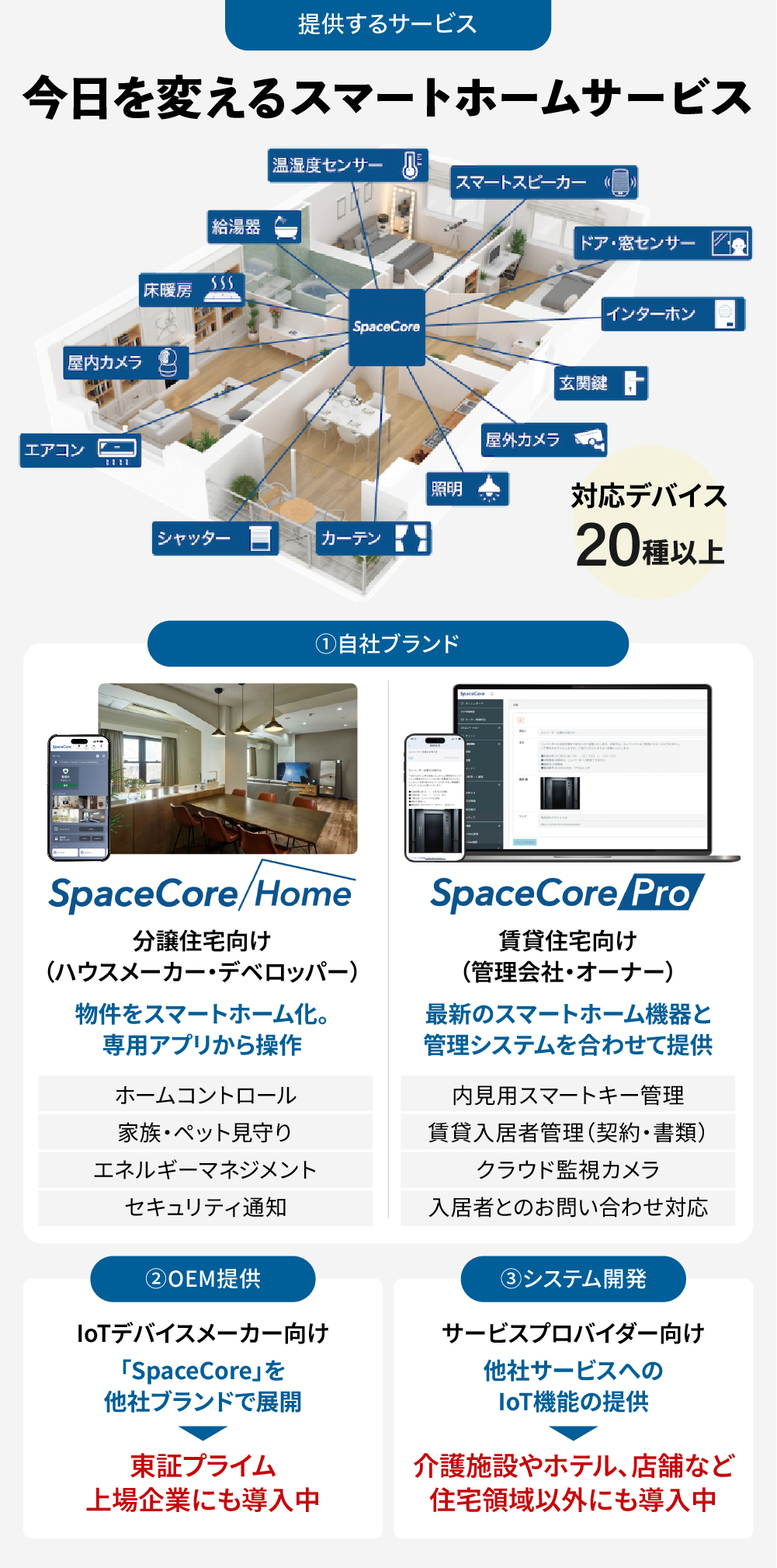 弊社は、事業者向けにスマートホームサービスを展開してまいりましたが、2024年10月に一般のご家庭でもご利用いただける「SpaceCoreHome」をリリースいたしました。ハウスメーカー様等を通じて導入いただけるこのサービスは、ご家庭のライフスタイルに合わせて自由にカスタマイズできるスマートホーム体験を実現します。