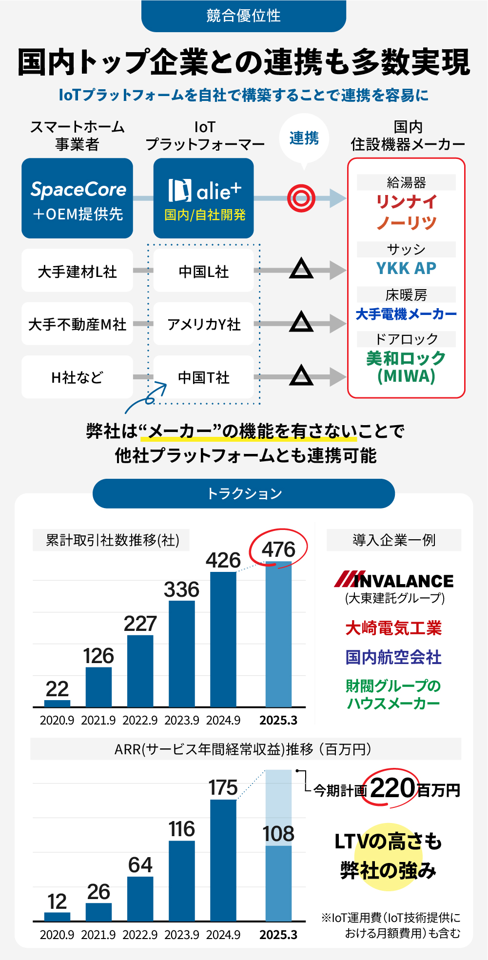また、全ゲートウェイを自社開発の「aliehub」に一本化し、美和ロック株式会社をはじめとする提携先拡大を加速。「Matter」対応を契機とした新規取引の増加も見込んでいます。さらに、「alie+Connect」は建設DXなど、既存領域以外での拡大が進んでおり、収益増加を計画しています。年間200社の新規開拓と18,000件以上の導入を目標に、成長基盤の強化を目指します。