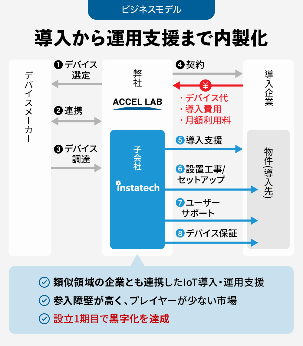 なお、このインスタレーション(設置・工事)領域は、専門性の高さから参入障壁が高く、プレイヤーが少ない市場です。インスタテックは設立1期目で黒字化を達成しており、ニーズの高さと事業ポテンシャルを実感しています。