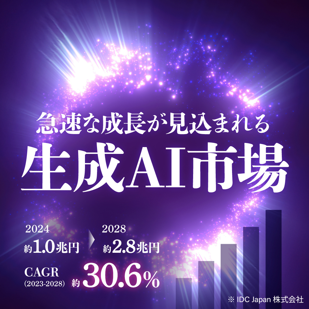 AIシステム市場は、今まさに急速な成長フェーズに突入しています。IT専門調査会社によると、日本国内の市場規模は2024年の約1.0兆円(前年比約41.6%増)から2028年には約2.8兆円に達する見込みで、2023年から2028年におけるCAGR(年平均成長率)は約30.6%%にも上る勢いです。さらに、生成AI市場は2024年に1,016億円に達し、CAGRは約84.4%で成長すると予測されています※。これはAIが社会インフラの一部として急速に普及・定着していくことを示唆しています。