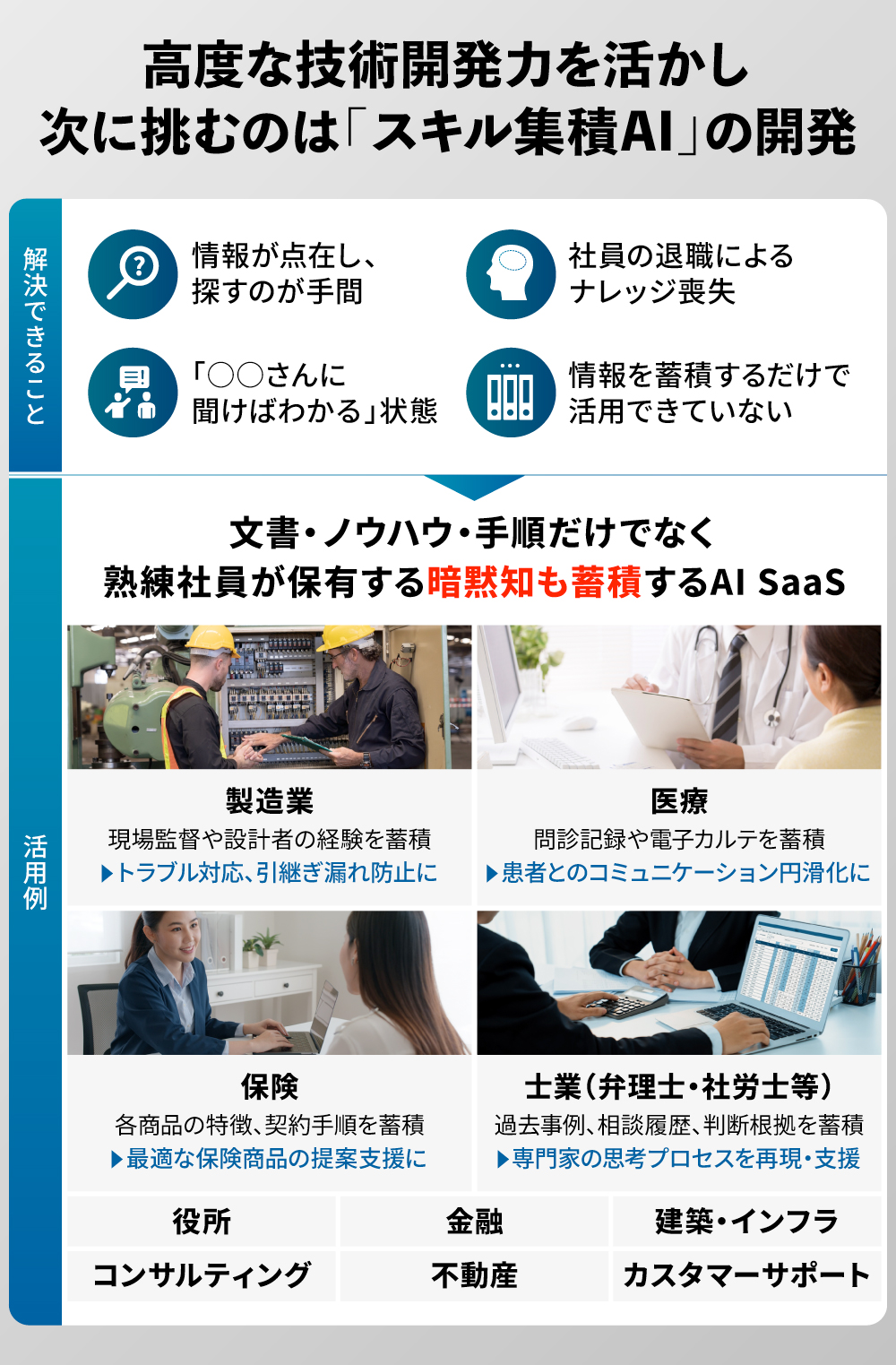 今後はこうした開発ノウハウをSaaSシステムに転換し、「スキル集積AI」としての提供を目指しています。同サービスは、企業内の熟練者が持つスキルやノウハウをAIに学習させ、技術継承や新人教育を効率化するプラットフォームであり、人材不足や技術継承の課題を抱える企業に革新的なソリューションを提供することを目指しています。