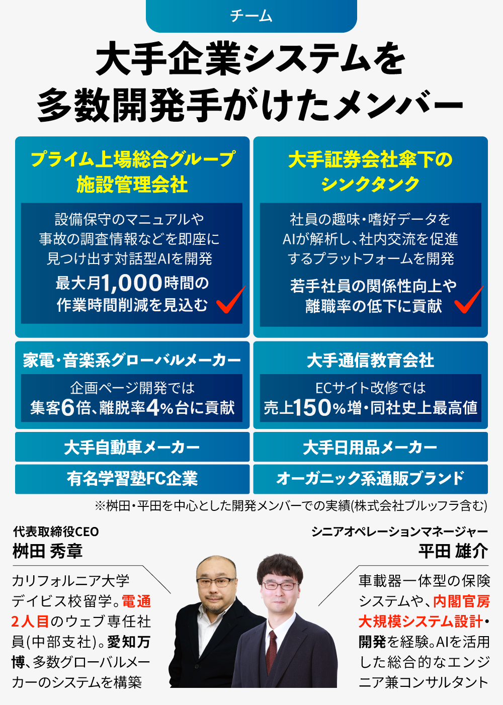 一般的に、大企業との直接取引を実現するには、複数年にわたる実績構築と信用の積み重ねが不可欠であり、多くのスタートアップは大手SIer※や代理店を通じた「下請け」として受注することになります。しかし弊社は、創業初期からSIerなどを介さずに、大手企業との直接契約も獲得してきました。その背景には、代表・桝田が電通やブルッフラ時代に培った大手企業との豊富な取引実績と、業界を横断した強固な顧客ネットワークという無形資産が存在します。
