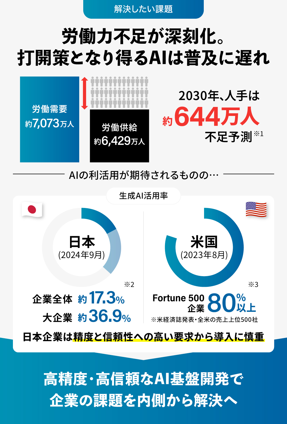 こうした課題解決においてAIの利活用が期待されるものの、実際の導入は進んでいません。帝国データバンクによると、生成AIを活用している日本企業は2024年9月でわずか約17.3%。一方、米国では2023年8月時点で、Fortune 500企業の80%以上の組織で利用されているという結果もあります。
