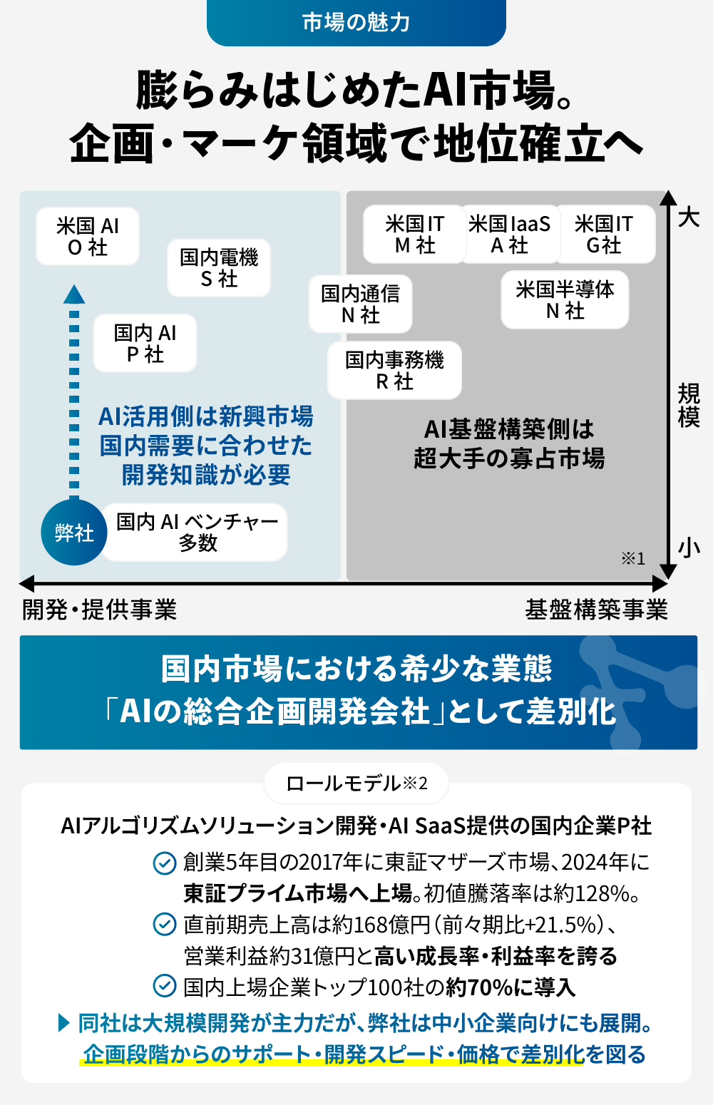 予測AI等を用いて業務課題を解決するP社がロールモデル。初値時価総額約700億円、騰落率約128%。同社は大企業特化型だが、弊社は中小企業もターゲットに差別化