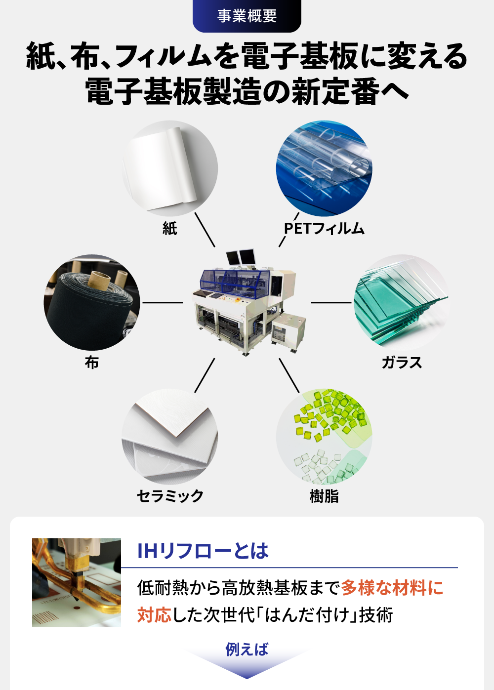 弊社は、「IHリフロー」と呼ばれる次世代の電子部品実装技術を軸に、革新的なものづくりインフラの構築を目指す技術系スタートアップです。主力事業は、IHリフロー装置の開発・販売に加え、同装置を活用した電子部品製造の受託事業「IH-EMS」です。