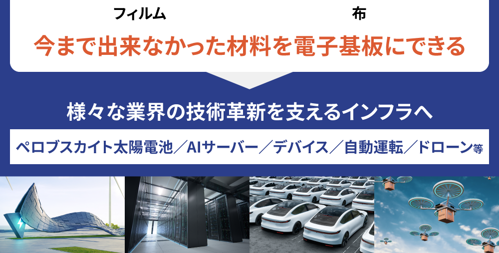 これにより、電子基板化が困難とされてきた樹脂やフィルムといった低耐熱材料も電子基板に変えることができます。既に複数の大手上場企業やNEDOなど公的機関からも高い評価を受けています。