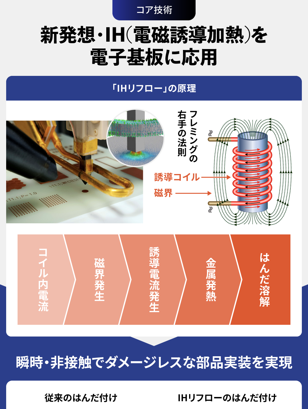 「IHリフロー」は、電子部品製造に欠かせない「はんだ付け」のブレークスルーとなる革新的技術です。瞬時に、非接触かつ局所的にはんだ付けすることでダメージレスな基板実装を実現します。