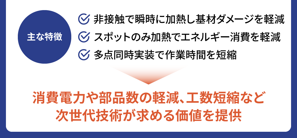 コアとなる技術は、はんだ接合部だけを瞬時に、非接触・ピンポイントで加熱する制御ノウハウです。これにより、従来は熱ダメージの問題で実装できなかった低耐熱材料から、放熱性の高い新素材まで、デバイスや素材の制約を受けない次世代ものづくりが実現します。