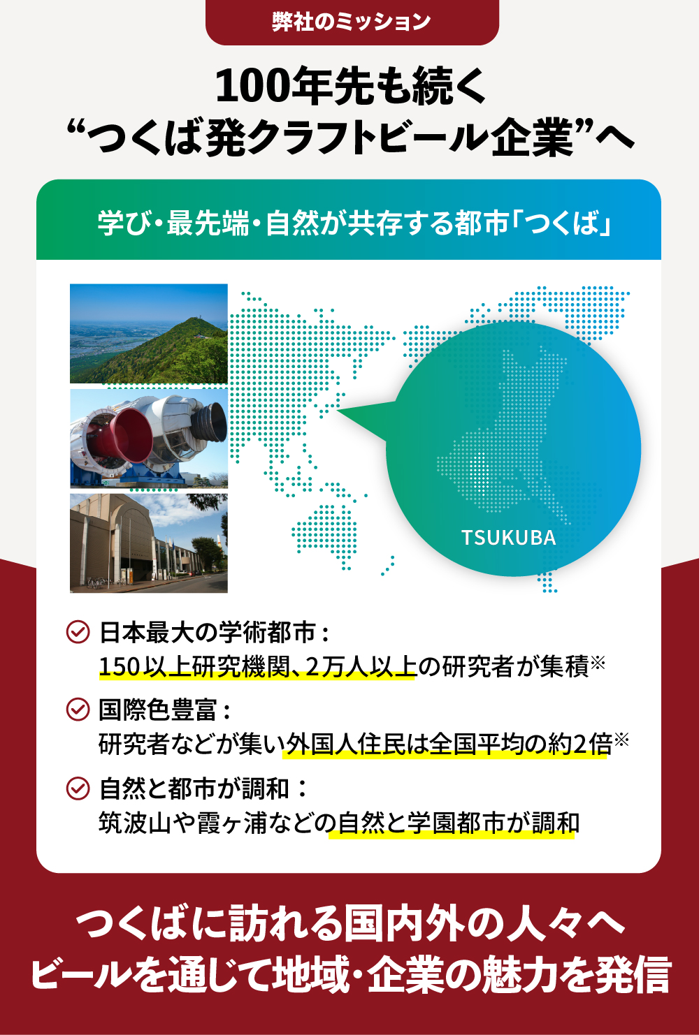 つくば市は、国内外から多くの研究者や留学生が集う国際的な研究・教育都市であり、筑波山をはじめとする観光拠点にも恵まれています。私たちは、国内外からのお客様にクラフトビールを通じてつくばの多様な魅力を五感で感じていただき、それを世界中へ持ち帰っていただきたいと考えています。