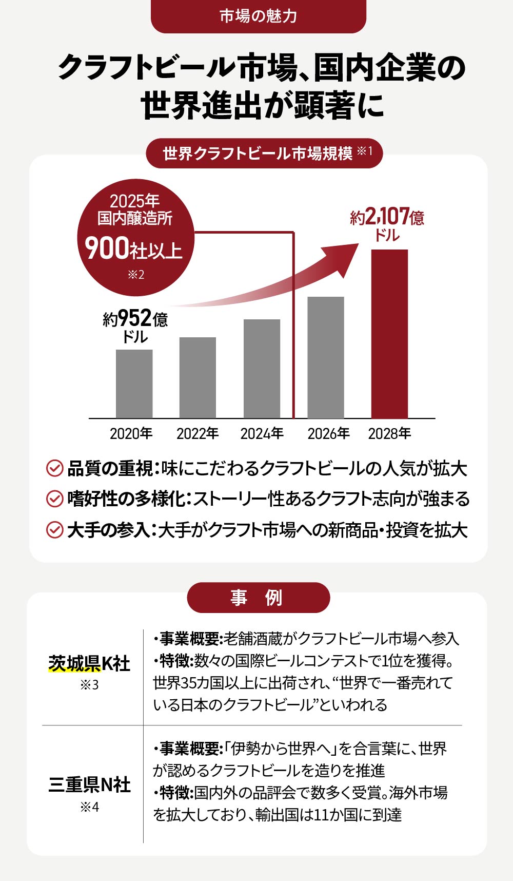世界のクラフトビール市場は、2020年の約952億3千万ドルから2028年には約2,107億8千万ドルに成長すると予測されており※2、米国ではクラフトビールのビール市場占有率が金額ベースで約27%を占めています※3。