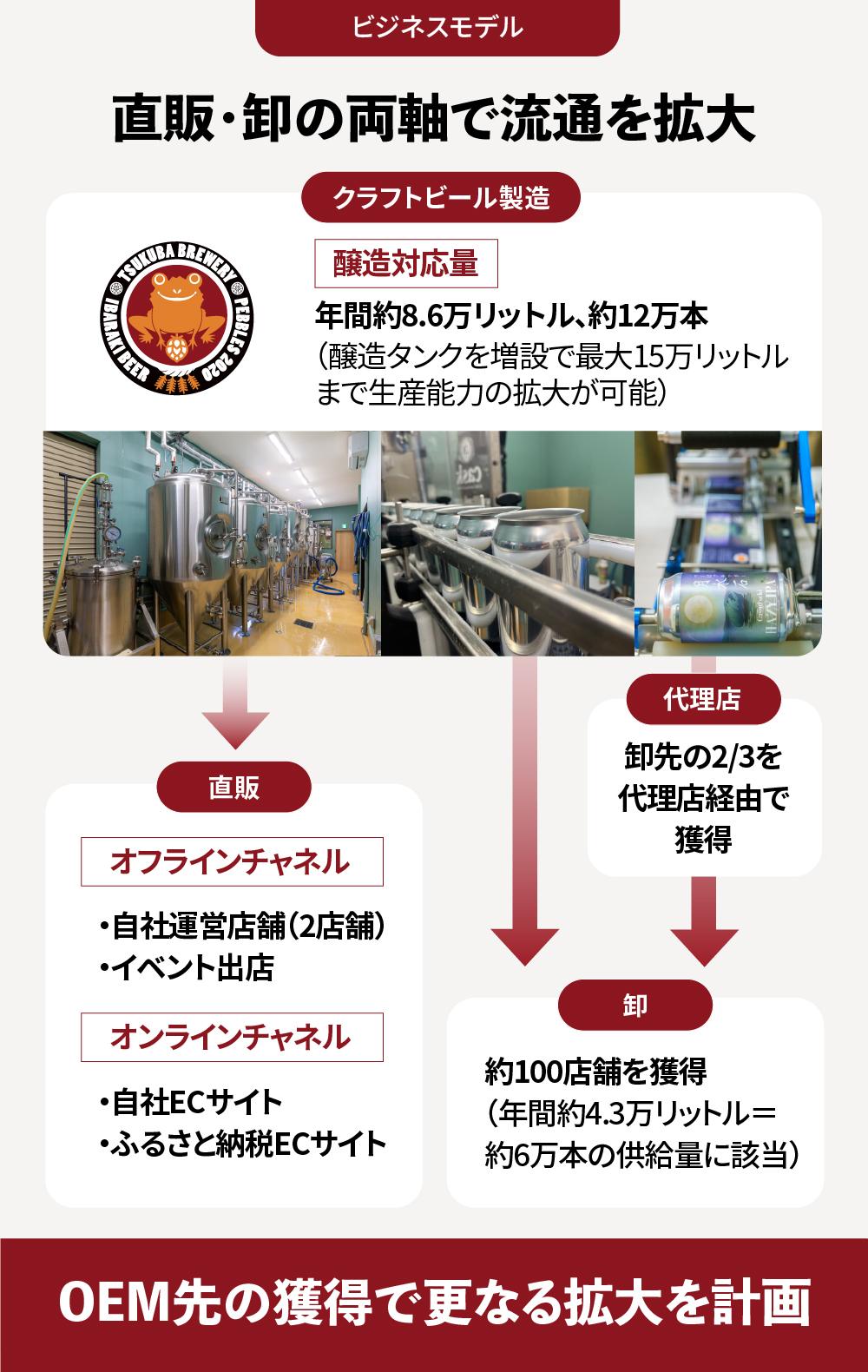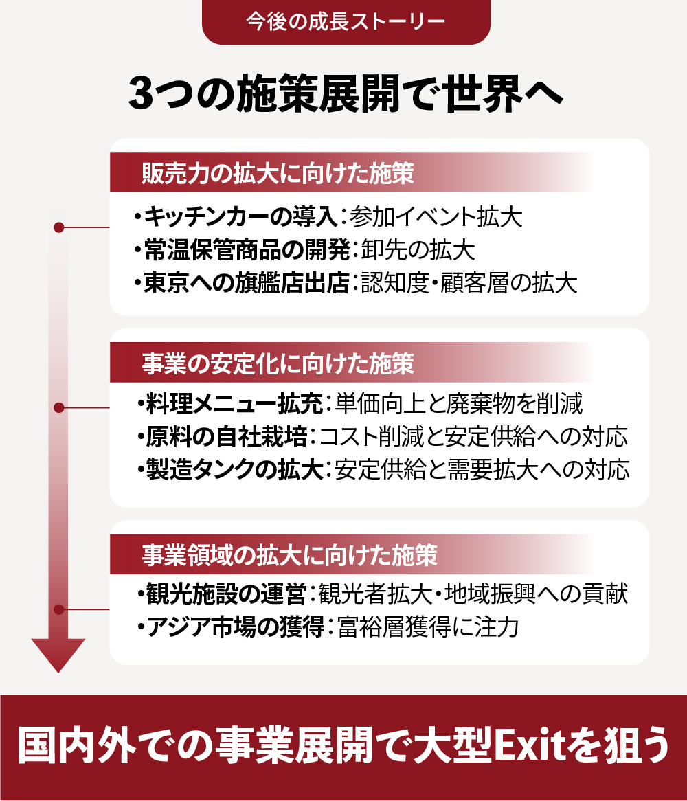 卸販売先は小規模酒販店や飲食店を中心に拡大し、大規模取引先も増やします。常温保管できる商品を開発することで卸売数量を倍増させることを目指します。