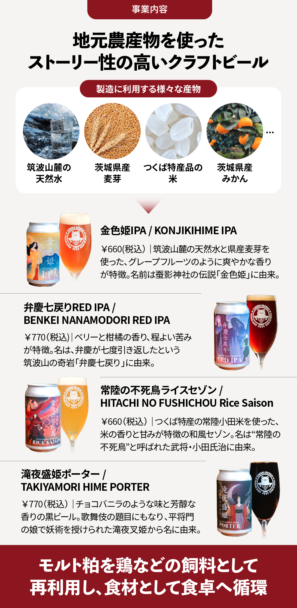 定番7種に加えて地域の食材を活用した季節限定商品も随時展開。ビールのラベルデザインは「和」を基調としており、つくばの伝説や自然モチーフを取り入れることで「飲んで・見て・語れる」ビールづくりを志向しています。