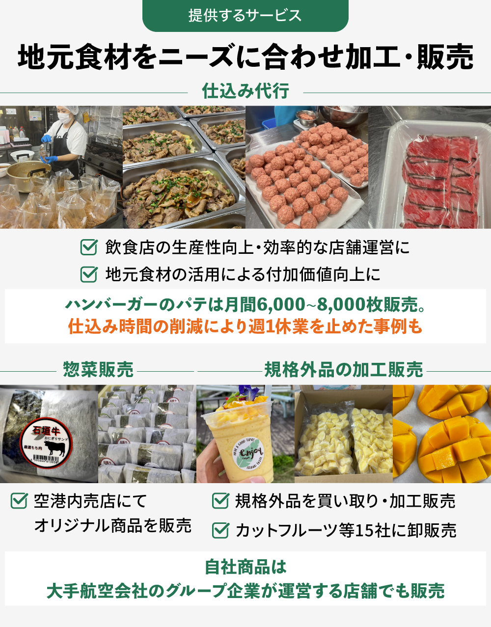 石垣島を拠点に飲食店の人材不足を解消するための「仕込み代行業」からスタートし、地域独自の連携型六次産業、離島の食のインフラの構築、精度の高い雇用に注力。