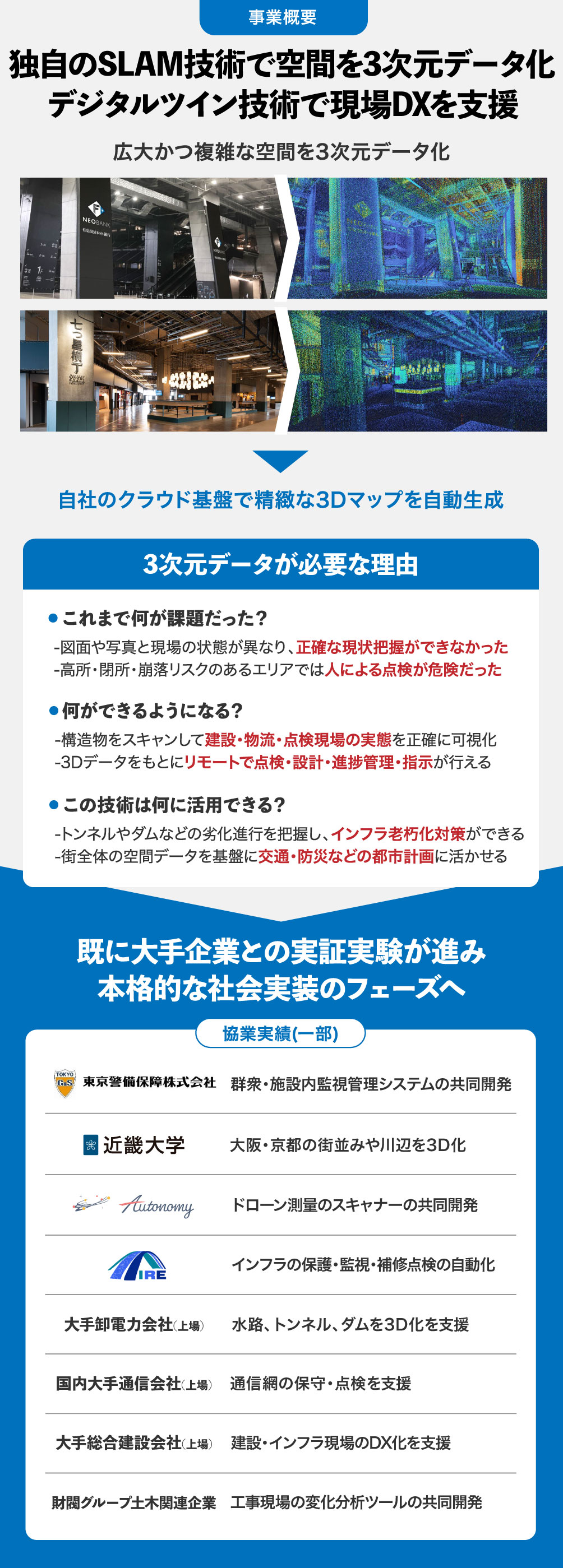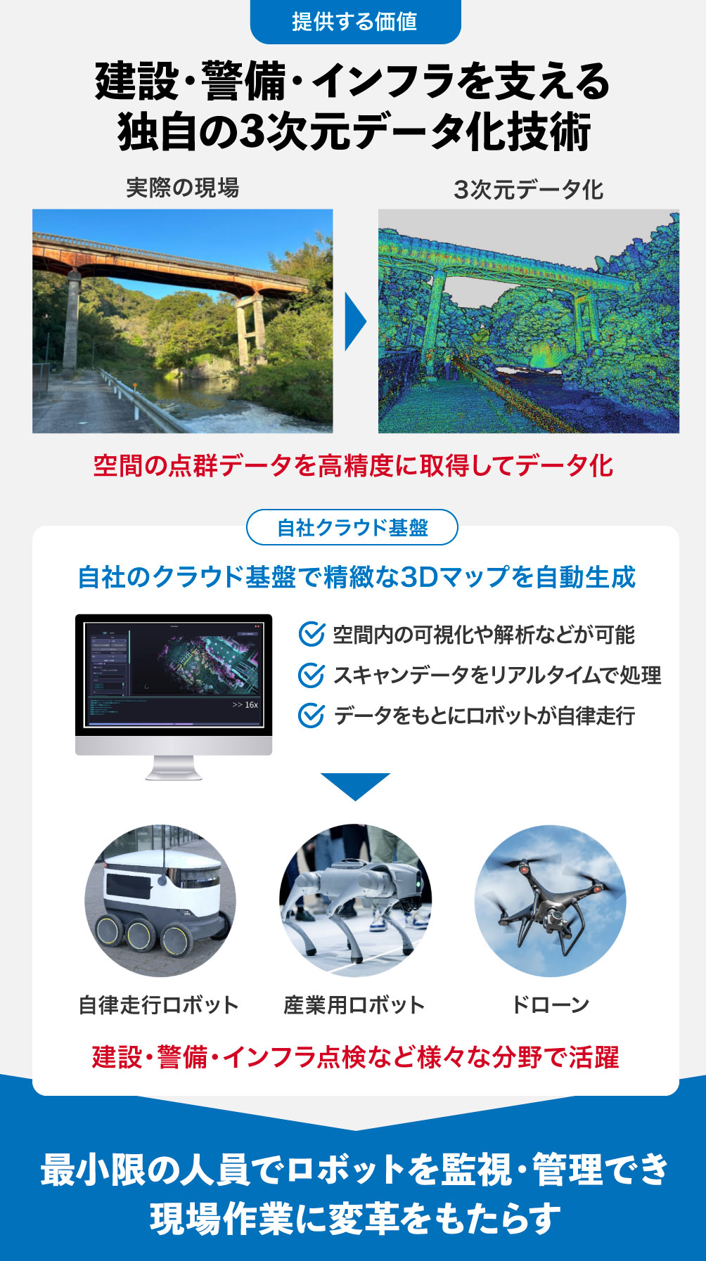 自社開発の3次元スキャナーを用いて、広大かつ複雑な空間の点群データを高精度に取得し、自社のクラウド基盤で精緻な3Dマップを自動生成する技術を強みとしています。