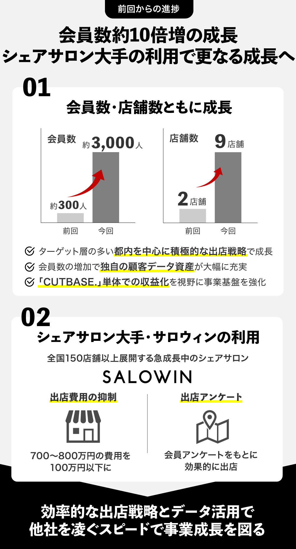 出店戦略は1万人規模のアンケートを活用したドミナント型で、精度の高い立地選定を実施。自社予約システム「CUTBASE.」にはEC機能を組み込み、来店データを活用したプロダクト販売で平均単価の向上を図ります。
