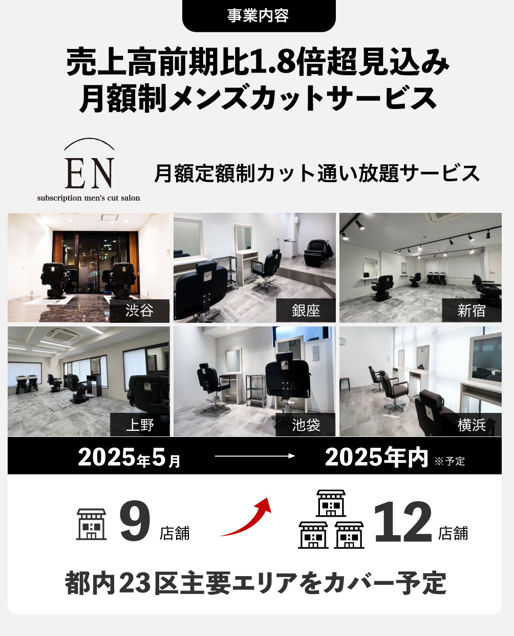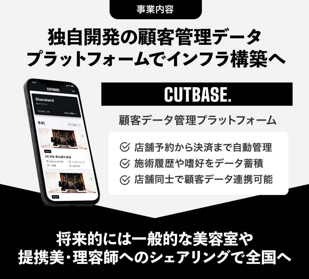 弊社は、月額定額制カット通い放題の理美容室「EN」と顧客データ管理プラットフォーム「CUTBASE.」を男性専門で展開しています。男性に特有の「美容室の価格・予約・時間へのストレス」という障壁を徹底的に解消し、シンプルかつスマートなサロン体験を提供しています。