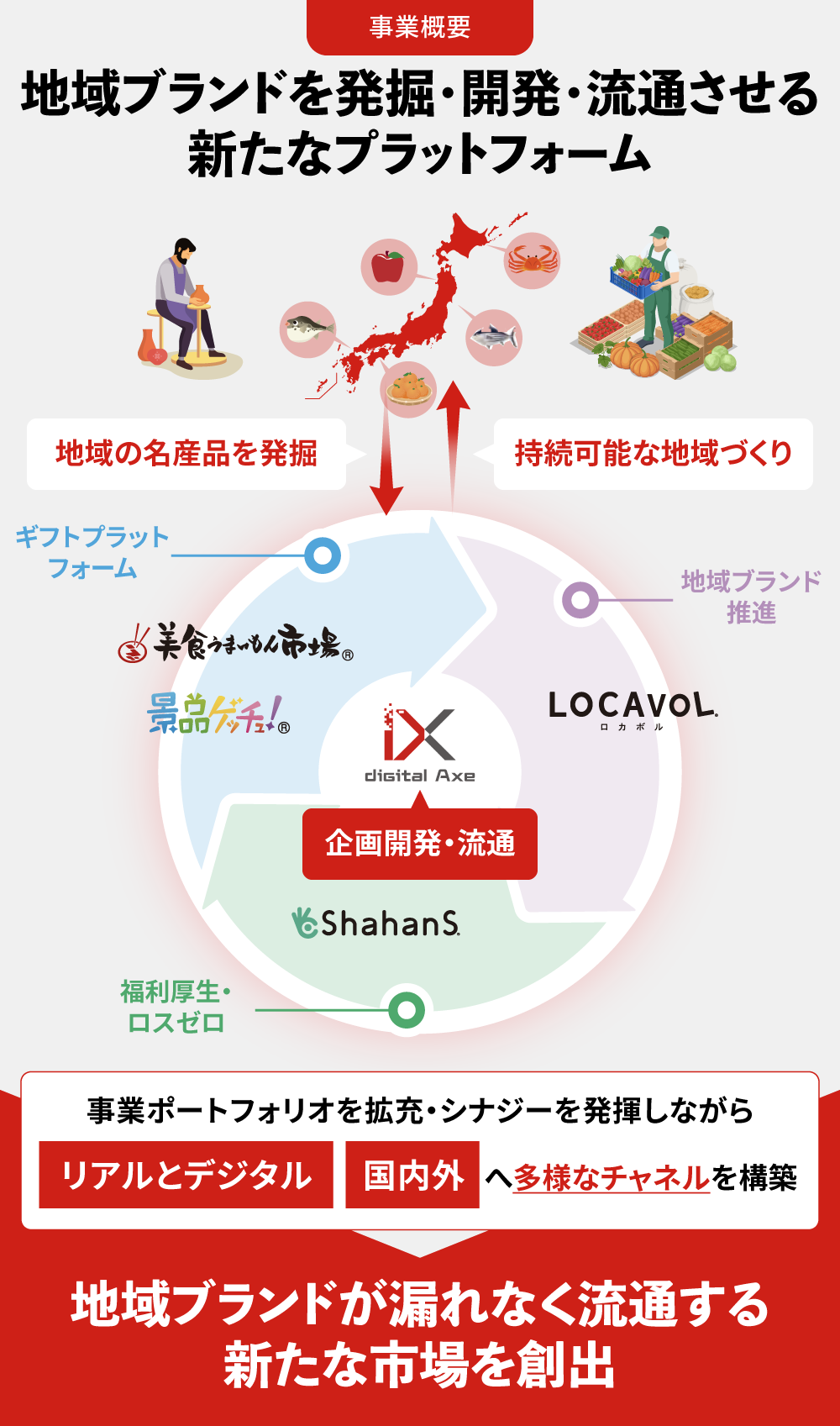 ãŸããå šåœåå°ã®åªããå°åç£åãåºåãªãã£ãã«ã§å±éããåœå å€ã®æ¶è²»è ã«å±ãããããã¯ãŒã¯ãæ§ç¯ãå°æ¹åµçãšçµæžæŽ»æ§åãé²ããèšç»ã§ãã