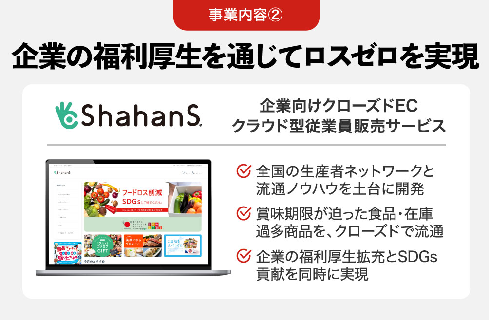 ãShahanSãã¯ããåœå°ã°ã«ã¡ã廿£äºå®ã®ååããäŒæ¥ãå£äœã®çŠå©åçãšããŠåŸæ¥å¡ã«è²©å£²ããBtoE圢åŒã®ãµãŒãã¹ã§ãã