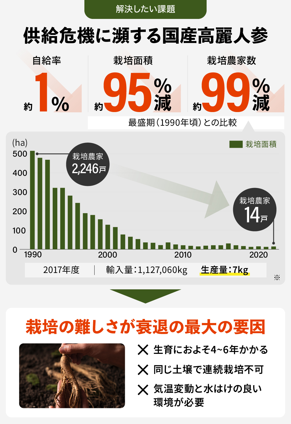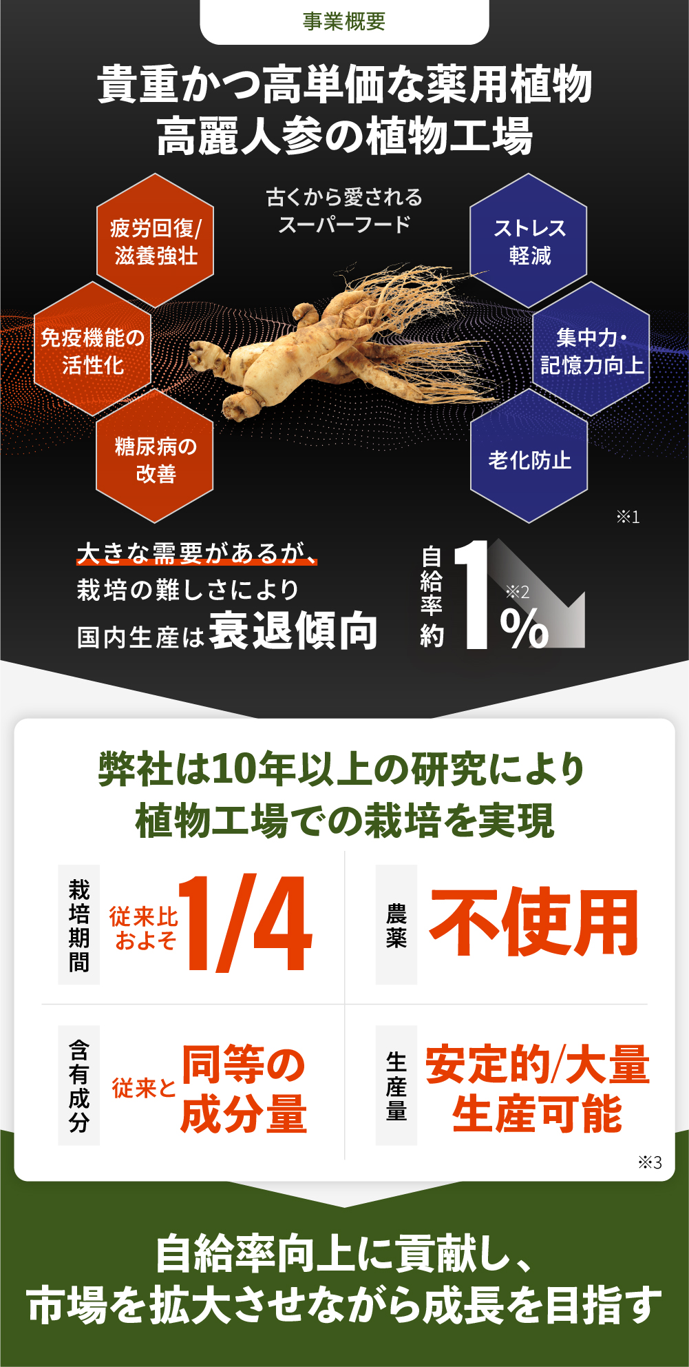 その結果、現在日本は中国・韓国からの輸入に依存し、自給率は約1%です※。また、輸入品にはサプリメントに残留農薬の検出事例もあり、地政学的リスクも無視できません。弊社はこの課題を植物工場技術により解決し、質の高い国産高麗人参の安定供給を目指します。