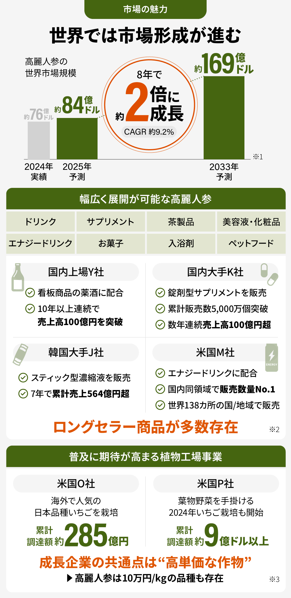 高麗人参サプリが主力のK社は年商100億円超※。大型資金調達を実施した植物工場企業をベンチマークに、高単価作物で同様の成長を狙う
