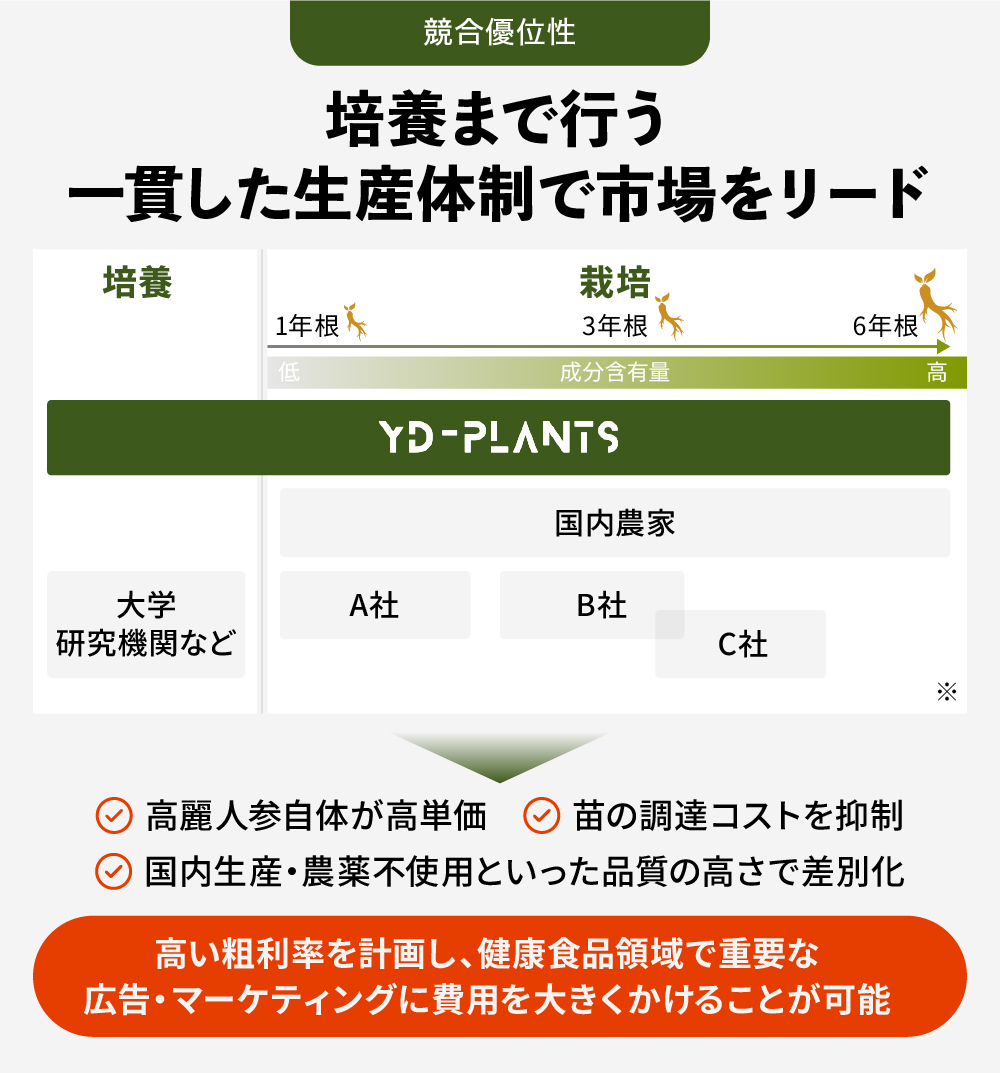 高麗人参は古来より健康維持に用いられてきた素材でありながら、日本市場ではその大半が輸入に依存しているのが現状です。その中で、国産・高品質の高麗人参を安定供給できる仕組みを構築するという試みは、国内外のサプリメント・健康食品市場において他社にはない競争優位性を発揮できるものだと確信しています。