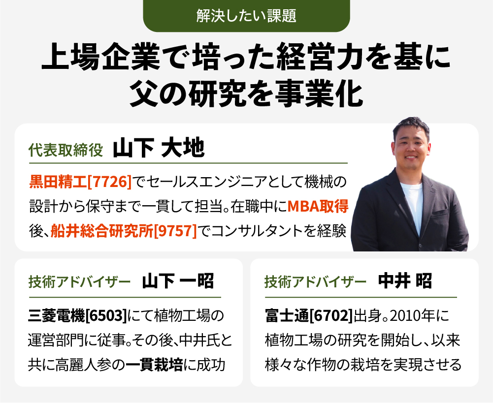 弊社の技術的基盤は、代表の父である山下一昭とそのビジネス仲間である中井氏が築きました。山下一昭は三菱電機[6503]勤務時代から10年以上かけて葉物野菜の植物工場ビジネスに従事し、退職後にビジネス仲間と共に高麗人参の一貫した栽培技術を確立。この研究成果を事業化したのが弊社であり、山下一昭及び中井氏はアドバイザーとして参画しています。