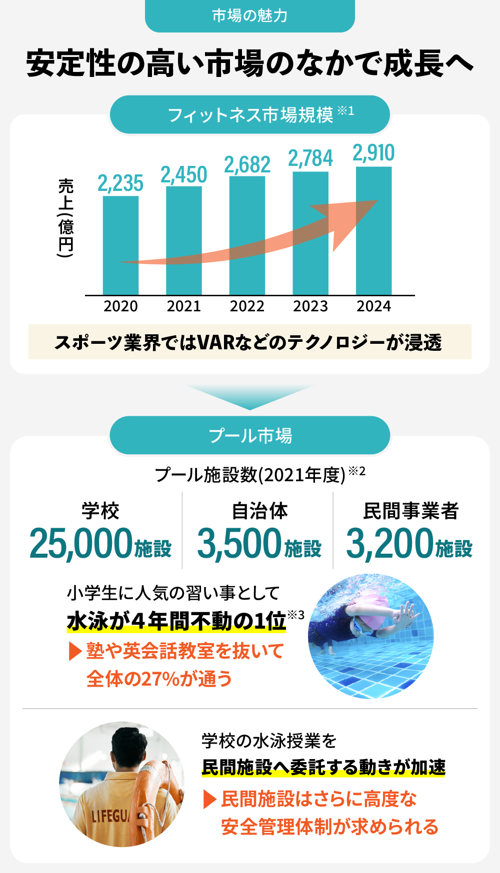 学校の水泳授業は民間企業へ委託される動きが全国で加速※2。高い安全性が求められる中、弊社製品は市場ニーズと合致